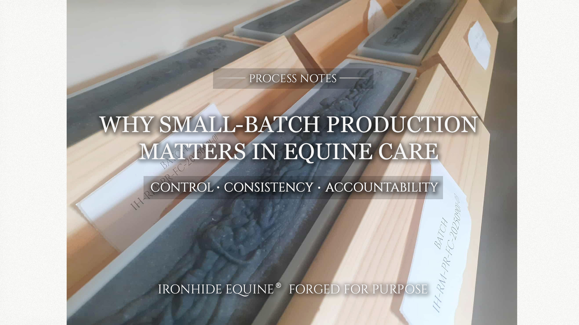 Small-batch production isn’t about scale — it’s about control, consistency, and care. This article explains why Ironhide Equine chooses deliberate, traceable batches, and how that decision directly affects product quality, safety, and trust.
